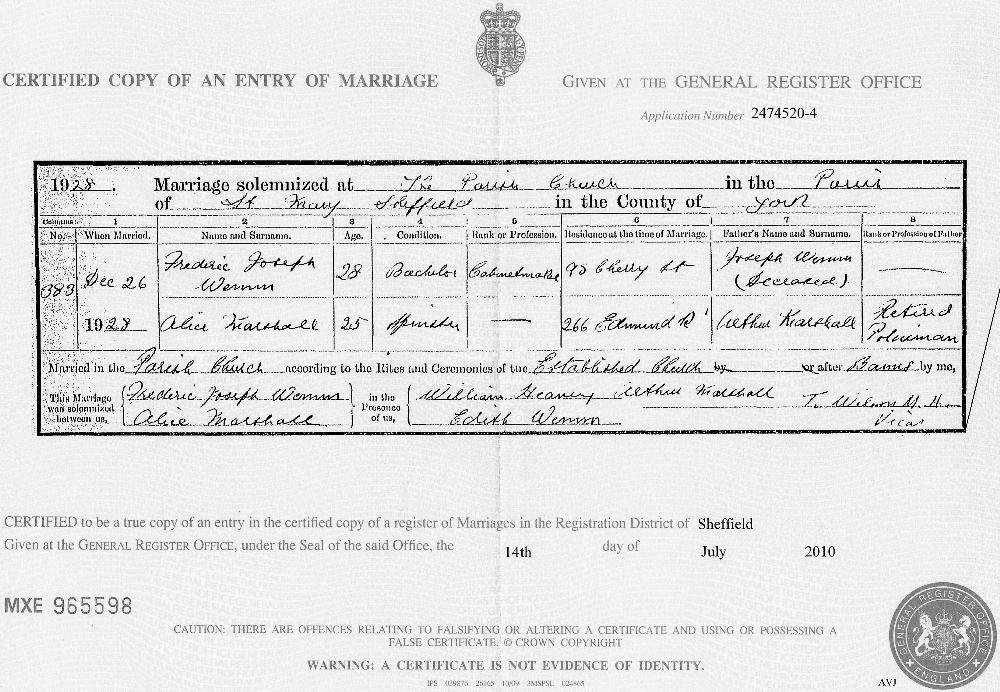 Source: WEMM, Joseph Frederic & MARSHALL, Alice 1828 Marriage, WEMM, Frederic Joseph 1928 Q4 Marr FreeBMD